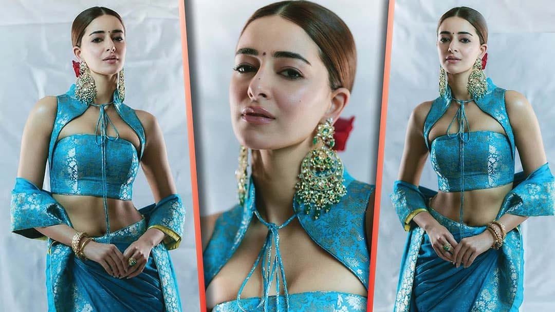 एक्ट्रेस ने इस बार ब्लू बनारसी साड़ी को चुना है, जिसमें बेहद बारीक गोल्डन जरी की कारीगरी की गई है। साड़ी पर किया गया हैंडवर्क इसे और भी एलिगेंट बना रहा है। अनन्या ने पल्लू को ट्रेडिशनल तरीके से नहीं, बल्कि रैप स्टाइल में लिया है, जिसमें उनका कर्वी फिगर फ्लॉन्ट हो रहा है। अनन्या के इस लुक को लेकर सबसे ज्यादा चर्चा उनके हॉल्टर नेक ब्लाउज पर हो रही है। इस ब्लाउज में मॉडर्न और ट्रेडीशनल का परफेक्ट मिक्स देखने को मिल रहा है। पीछे की ओर दी गई डोरी पूरे लुक का फोकस नेकलाइन पर ले आ रही है। इसी ब्लाउज को देखते हुए कई फैंस ने उन्हे ट्रोल भी किया है, लोगों का सवाल है कि उन्होंने इतना टाइट ब्लाउज कैसे मैनेज किया?