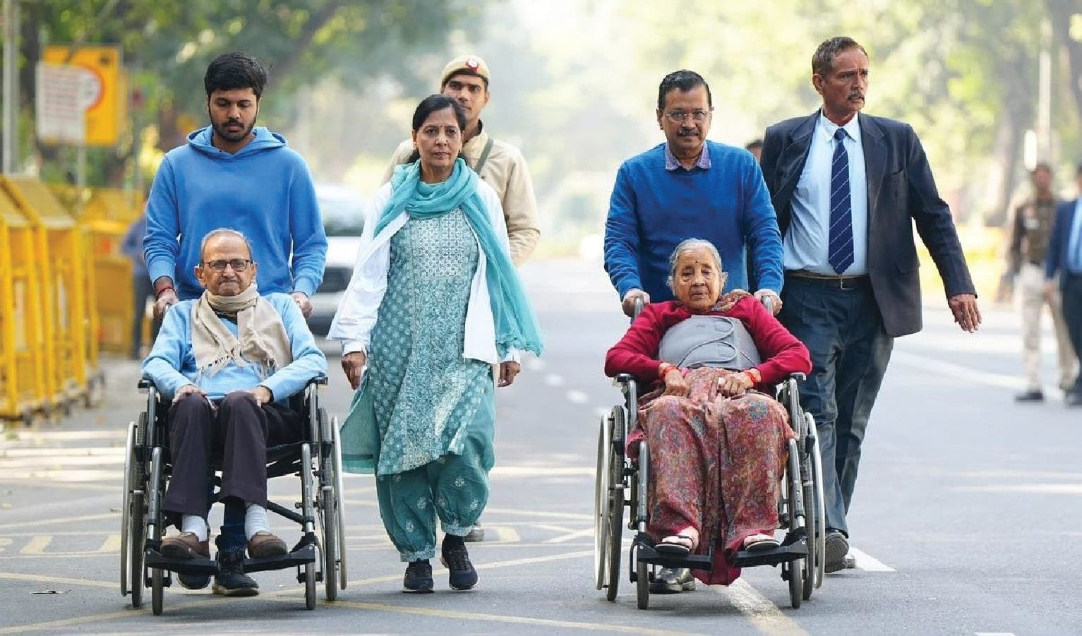 नई दिल्ली। आम आदमी पार्टी (आप) के राष्ट्रीय संयोजक और दिल्ली के पूर्व मुख्यमंत्री अरविंद केजरीवाल ने अपनी पत्नी सुनीता केजरीवाल और माता-पिता गोबिंद राम केजरीवाल और गीता देवी के साथ बुधवार को नई दिल्ली के लेडी इरविन सीनियर सेकेंडरी स्कूल में मतदान केंद्र पर अपना वोट डाला। सोशल मीडिया पर एक वीडियो वायरल हुआ जिसमें वह मतदान केंद्र पर व्हीलचेयर पर बैठे अपने माता-पिता के साथ नजर आ रहे हैं। वीडियो में केजरीवाल अपने मां की व्हीलचेयर को पकड़े हुए दिखाई दे रहे हैं, जबकि उनका बेटा व्हीलचेयर पर बैठे अपने दादा की मदद कर रहा है।