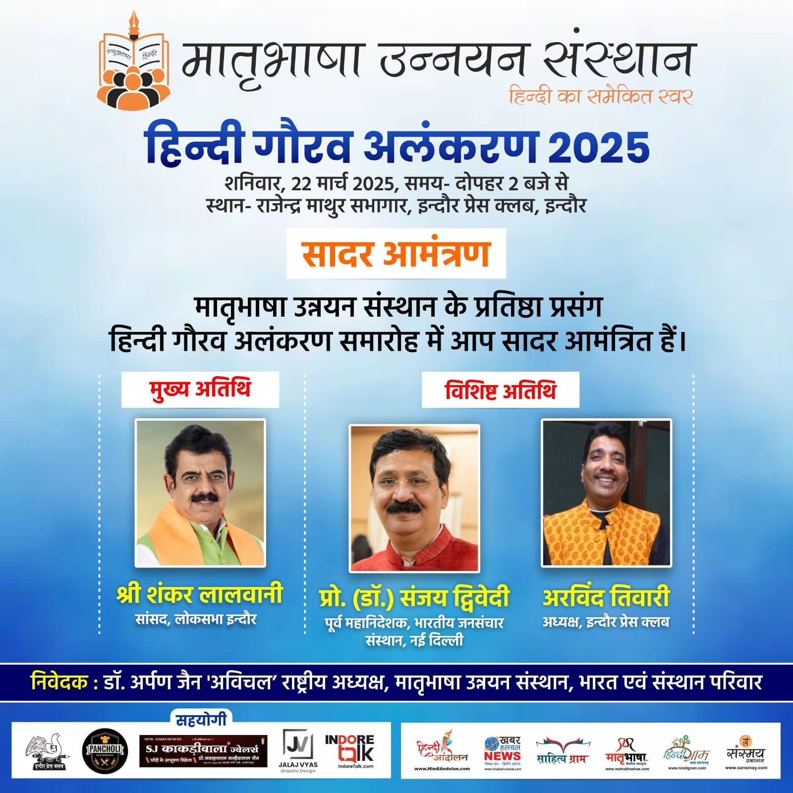 इंदौर। हिन्दी भाषा के विस्तार के लिए लगातार कार्यरत ‘मातृभाषा उन्नयन संस्थान’ शनिवार 22 मार्च 2025 को स्थानीय राजेन्द्र माथुर सभागार, इन्दौर प्रेस क्लब में दोपहर 2 बजे से हिन्दी गौरव अलंकरण समारोह आयोजित करने जा रहा है।