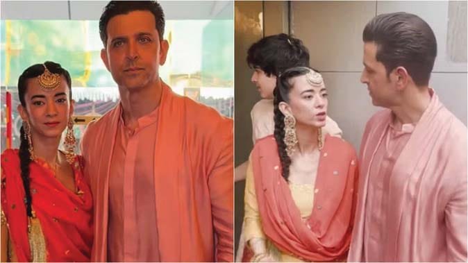 ऋतिक रोशन और सबा आजाद का एक वीडियो सोशल मीडिया पर वायरल हो रहा है। इसमें दोनों ट्रेडिशनल लुक में नजर आ रहे हैं। रिपोर्ट्स के मुताबिक ऋतिक फैमिली फंक्शन में गर्लफ्रेंड के साथ पहुंचे हैं। सबा पिंक और येलो कलर के ट्रेडिशनल आउटफिट में नजर आ रही हैं। बड़े-बड़े ईयरिंग्स मांग टीके के साथ उन्होंने अपना लुक कंपलीट किया है। वहीं, ऋतिक पिंक और व्हाइट कलर के कुर्ता पाजामे में दिख रहे हैं।