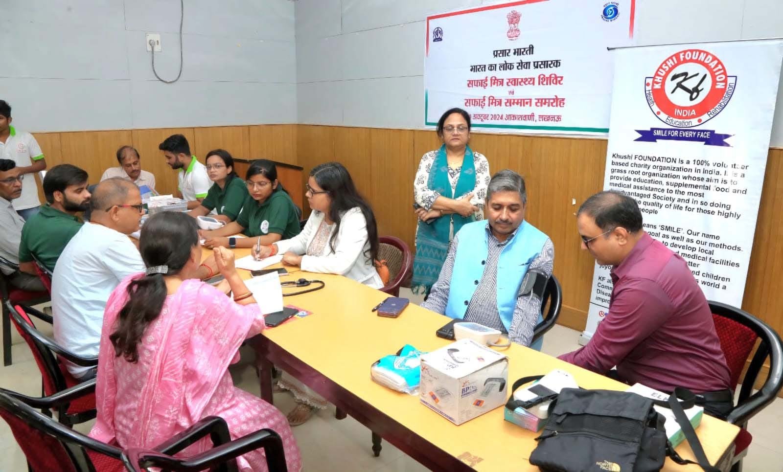 लखनऊ। देश भर में चलाये जा रहे विशेष स्वच्छता अभियान के तहत गांधी जयंती की पूर्व संध्या पर आकाशवाणी लखनऊ के तत्वावधान में मंगलवार को आकाशवाणी के कांफ्रेंस हाल में ख़ुशी फाउंडेशन के सहयोग से सफाई मित्र स्वास्थ्य शिविर और सफाई मित्र सम्मान समारोह का आयोजन किया गया। इस मौके पर आकाशवाणी के कर्मचारियों की आँखों की जाँच के साथ ही ईसीजी, ब्लड प्रेशर, शुगर और अन्य कई जांच मुफ्त की गई। इसके अलावा प्रमुख आयुष चिकित्सक डॉ. अवधेश द्विवेदी ने स्वस्थ जीवन शैली अपनाने के जरूरी टिप्स भी दिए।