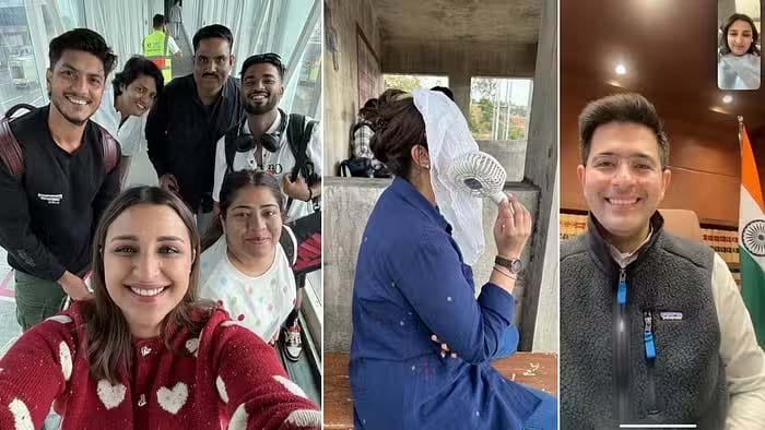 परिणीति चोपड़ा ने अपने आगामी प्रोजेक्ट के सेट से कुछ बिहाइंड द सीन शेयर करने के लिए इंस्टाग्राम का सहारा लिया। पहली तस्वीर में परिणीति नीली शर्ट और जींस में नज़र आ रही हैं और उनके हाथ में एक छोटा पंखा है। अभिनेत्री ने अपना चेहरा सफेद कपड़े से ढका हुआ है। दूसरी तस्वीर में परिणीति अपनी टीम के साथ पोज देते हुए एक मिलियन-डॉलर की मुस्कान बिखेरती नजर आ रही हैं। उन्होंने मैरून स्वेटर पहना हुआ है जिस पर सफेद दिल बने हुए हैं। तीसरी तस्वीर में परिणीति किसी कैंप में रजाई में लिपटी नजर आ रही हैं। चौथी तस्वीर में टेबल पर रखे खाने की झलक है। पांचवीं तस्वीर में परिणीति अपने पति राघव चड्ढा से वीडियो कॉल पर बात करती हुई नजर आ रही हैं। इसके अलावा परिणीति ने कई वीडियोज भी शेयर किए हैं।