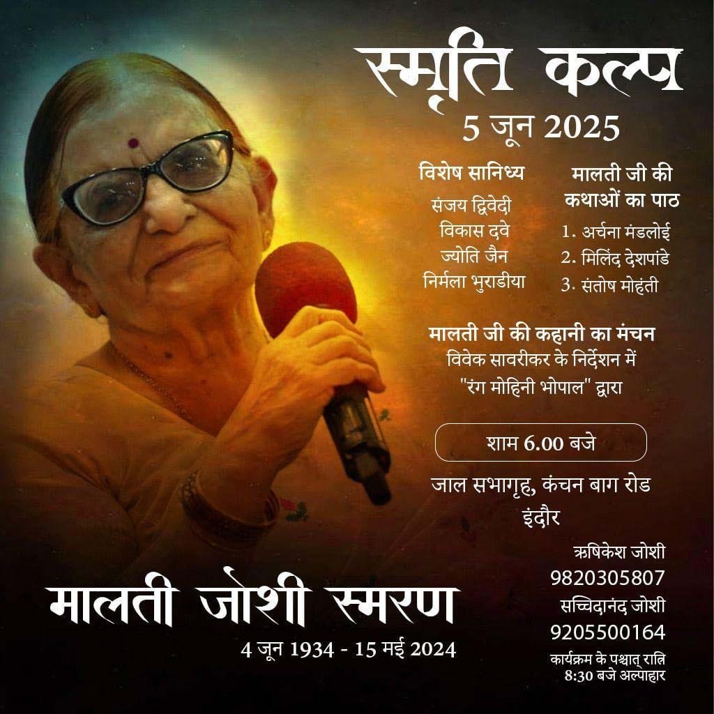 श्रीमति मालती जोशी का इंदौर से गहरा संबंध रहा है। मालती जोशी पर केन्द्रित ग्रंथ ‘स्मृति कल्प’ का लोकार्पण भी इस अवसर पर होगा तथा उन पर केन्द्रित एक प्रदर्शनी भी लगायी जायेगी।