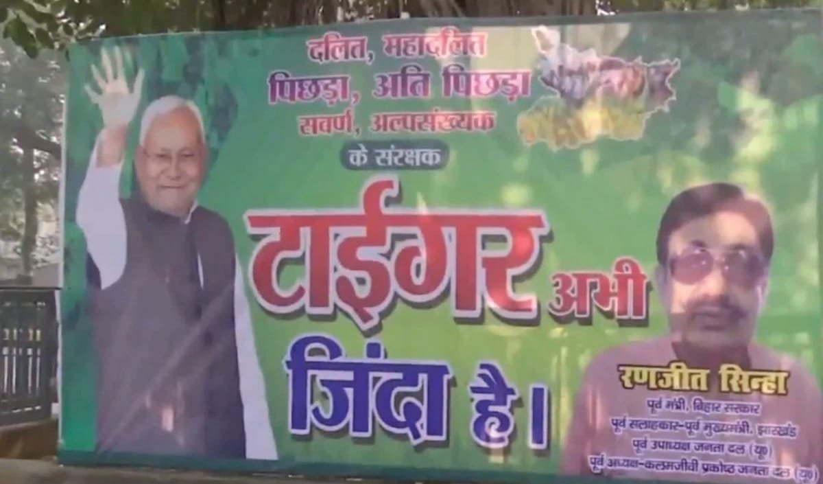 नई दिल्ली, एजेंसी। बिहार के पूर्व मंत्री रंजीत सिन्हा द्वारा पटना स्थित जनता दल (यूनाइटेड) कार्यालय के बाहर लगाए गए एक पोस्टर में मुख्यमंत्री नीतीश कुमार को ‘टाइगर ज़िंदा है’ की उपाधि दी गई है और उन्हें समाज के हाशिये पर पड़े लोगों सहित सभी समुदायों का “रक्षक” बताया गया है। यह पोस्टर पार्टी कार्यकर्ताओं की नीतीश कुमार को चौथी बार बिहार का मुख्यमंत्री बनते देखने की इच्छा को दर्शाता है। 2025 के बिहार विधानसभा चुनावों में विपक्षी महागठबंधन ने निश्चित रूप से मुख्यमंत्री पद के उम्मीदवार की घोषणा में देरी को लेकर कड़ी और लगातार आलोचना की है।