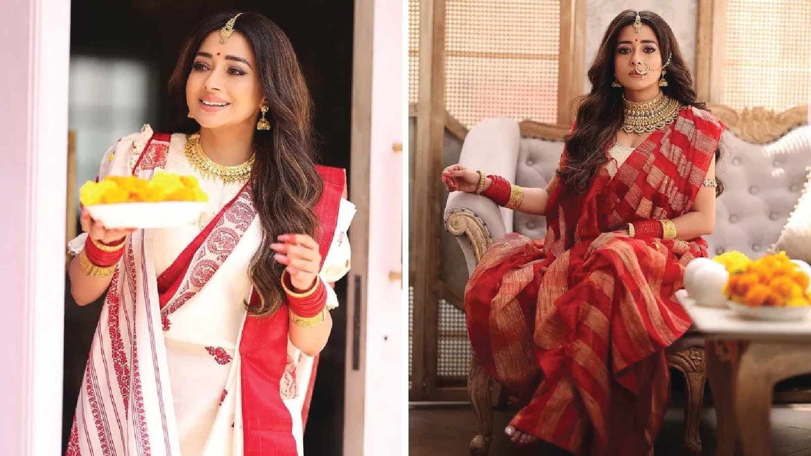 बंगाल में होने वाली भव्य की दुर्गा पूजा के बारे में तो सभी जानते हैं। आप नवरात्रि के दौरान बंगाली स्टाइल साड़ी बांध सकती हैं, जो वहां की संस्कृति को प्रदर्शित करती है। इससे आपको नवरात्रि में फेस्टिव परफेक्ट लुक पाने में आसानी होगी। एक्ट्रेस टीना दत्ता से साड़ी की डिजाइन और कलर का आइडिया भी लिया जा सकता है।
